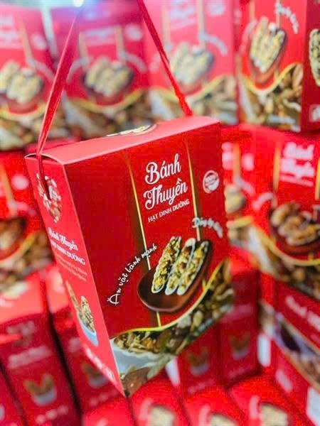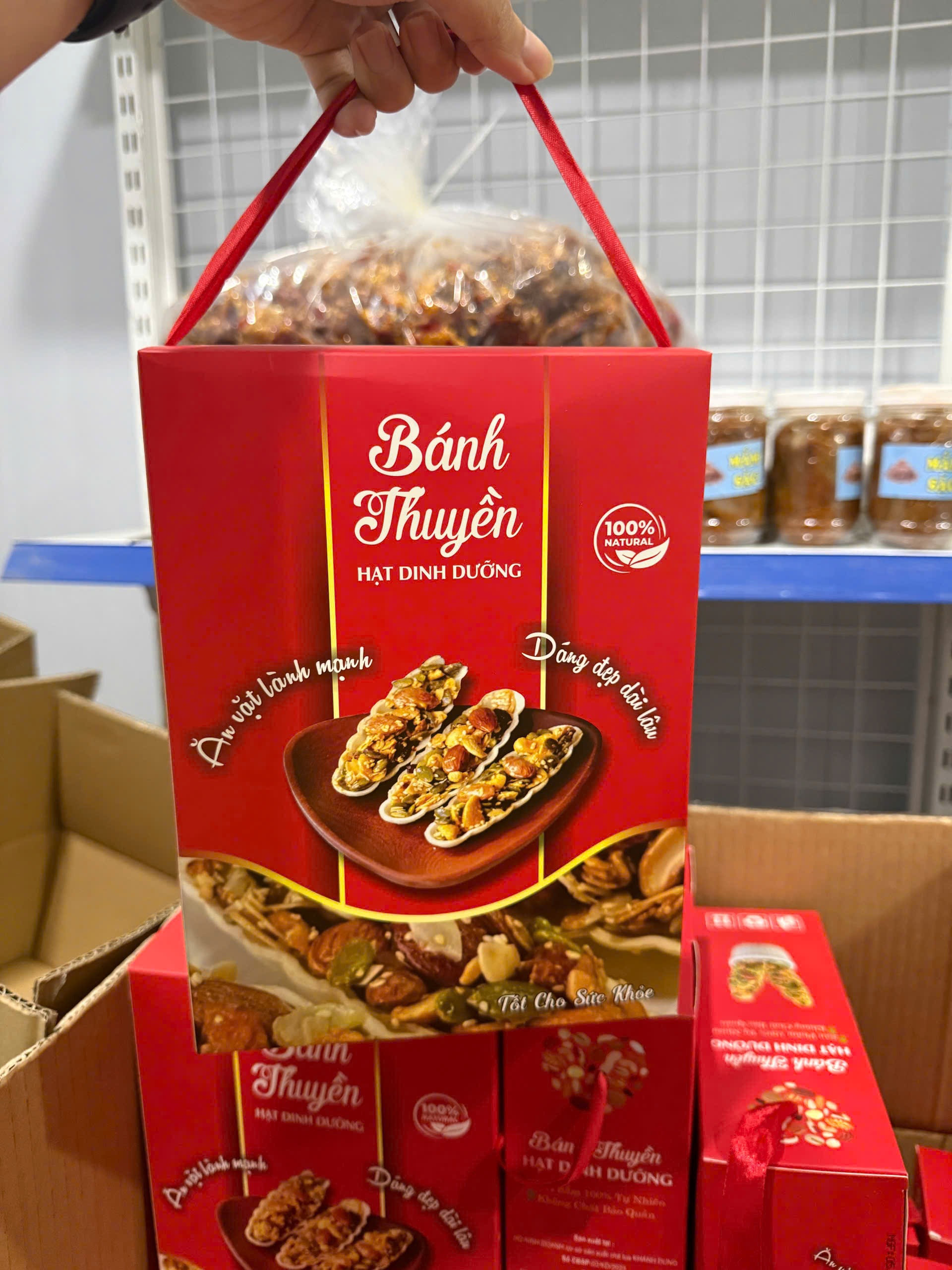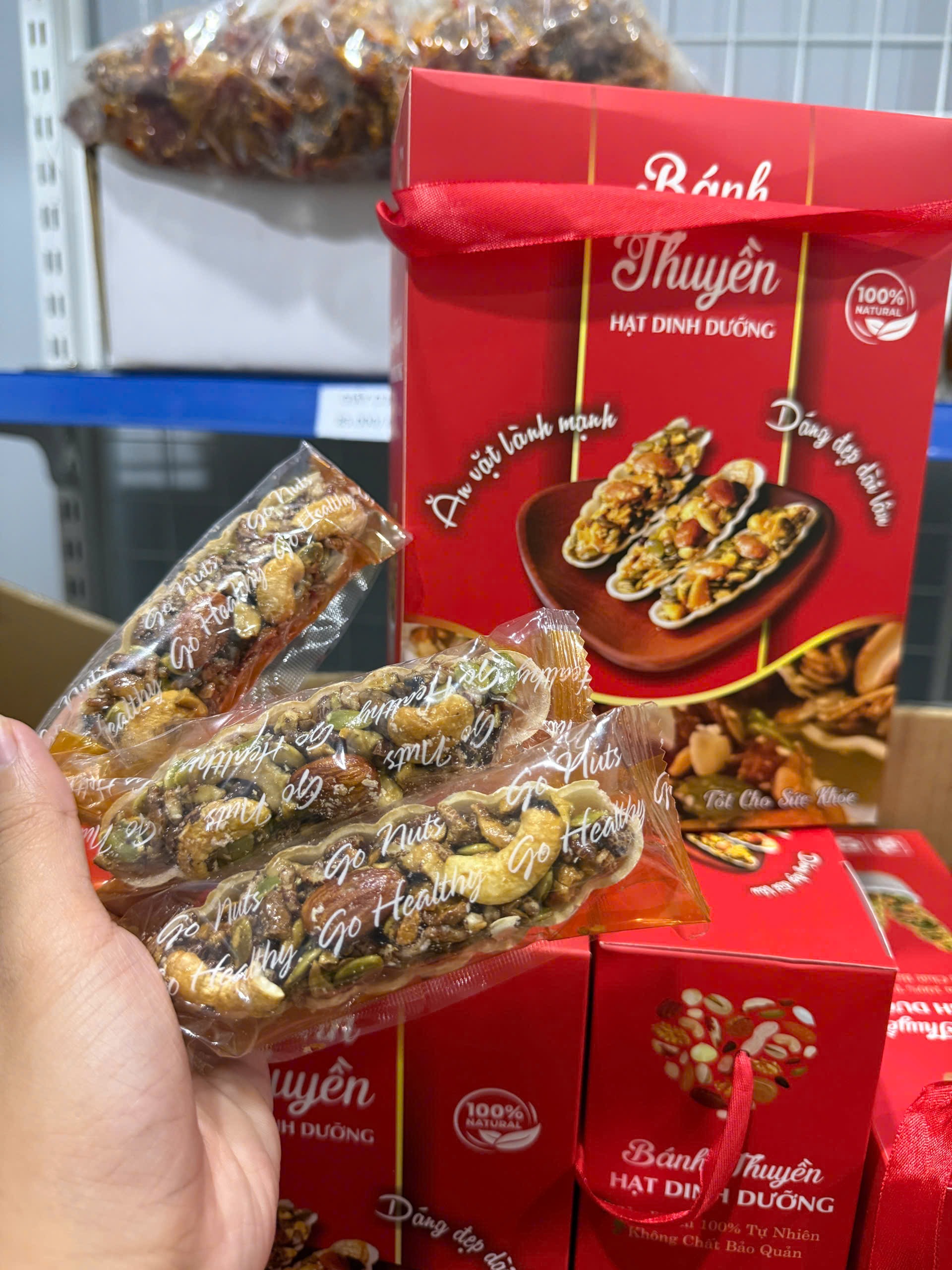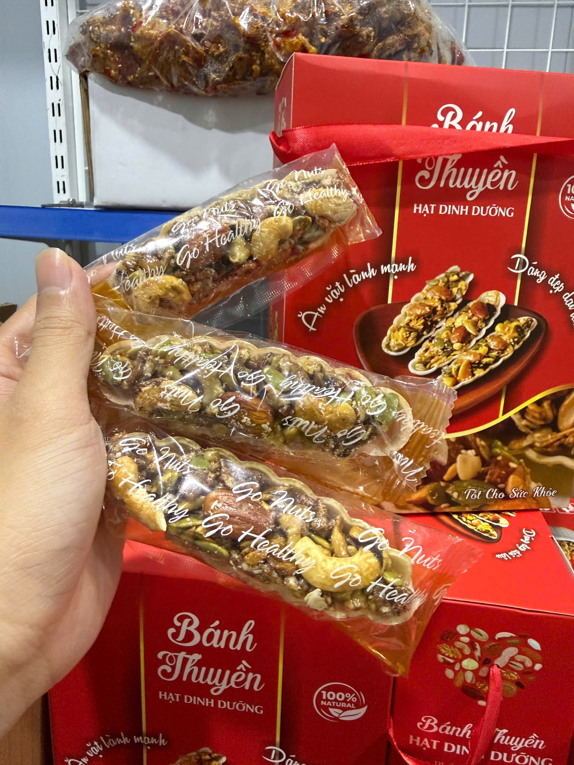 Sản phẩm là sự kết hợp của các loại hạt như hạt điều, hạnh nhân, hạt bí xanh, vừng, gạo lứt và mật ong, tạo hình dáng giống chiếc thuyền nhỏ.