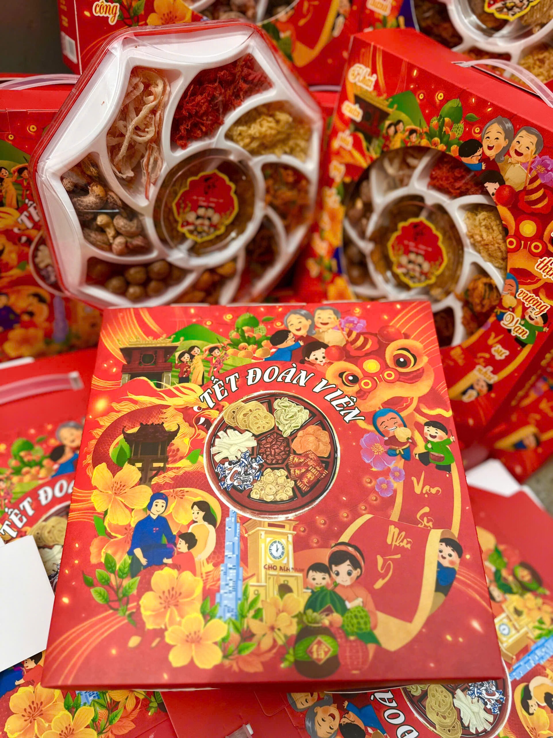 Hộp đỏ rực rỡ, hoạ tiết Tết truyền thống