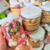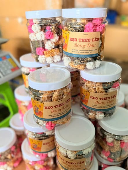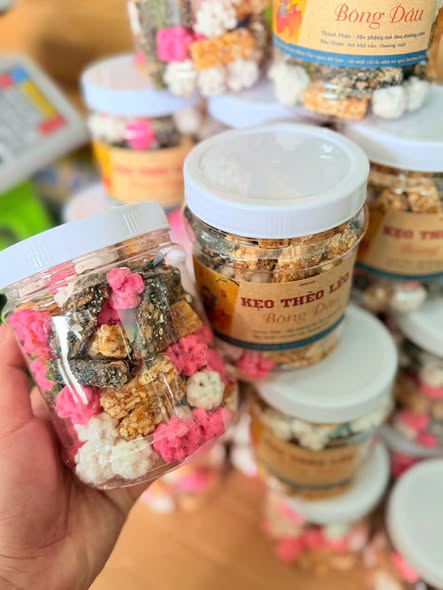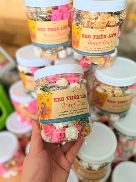 - Đặc điểm: Kẹo bao gồm các viên kẹo đậu phộng nhỏ (thèo lèo) kết hợp với các miếng bánh xốp màu hồng và trắng (bông dâu).