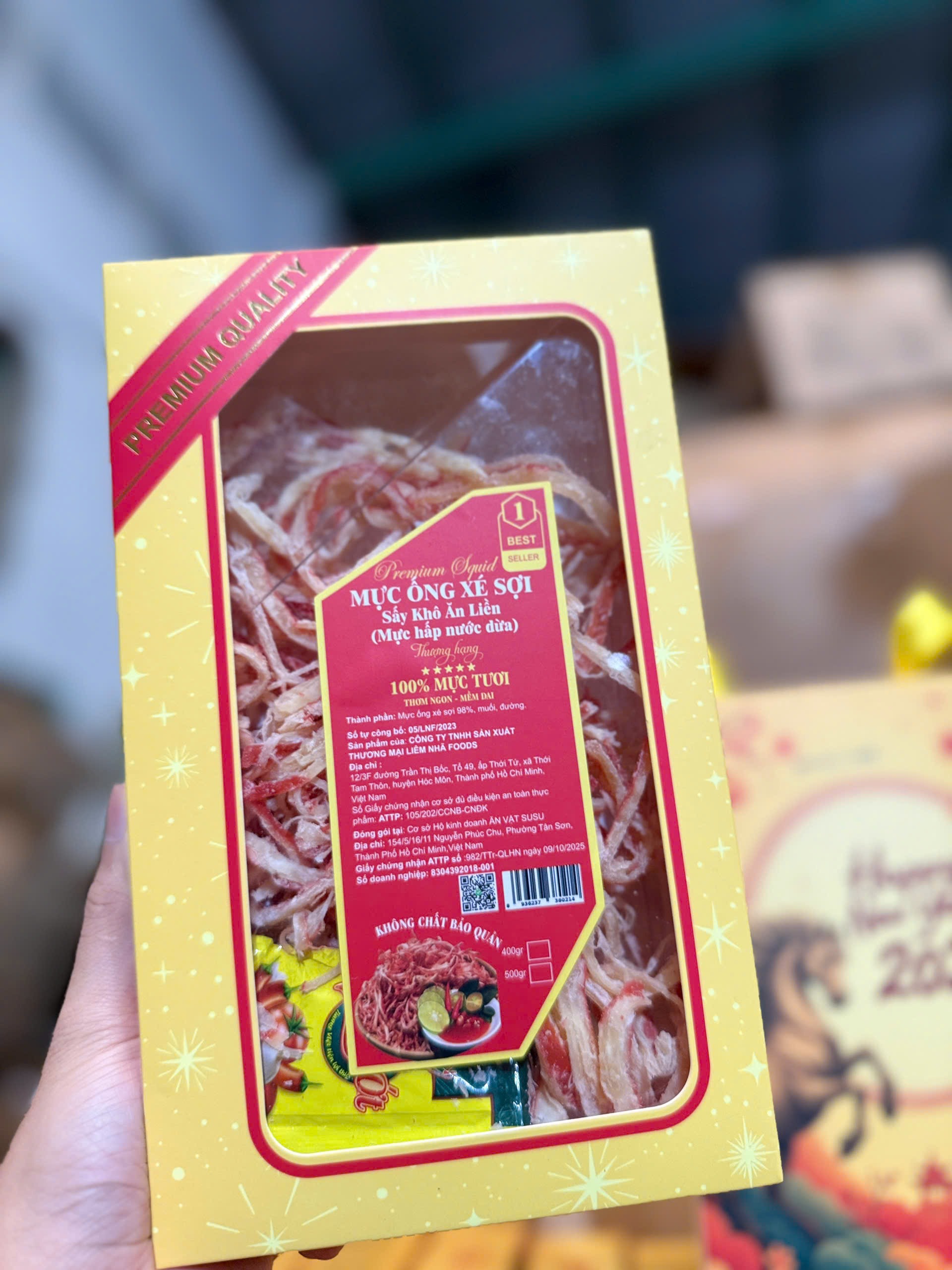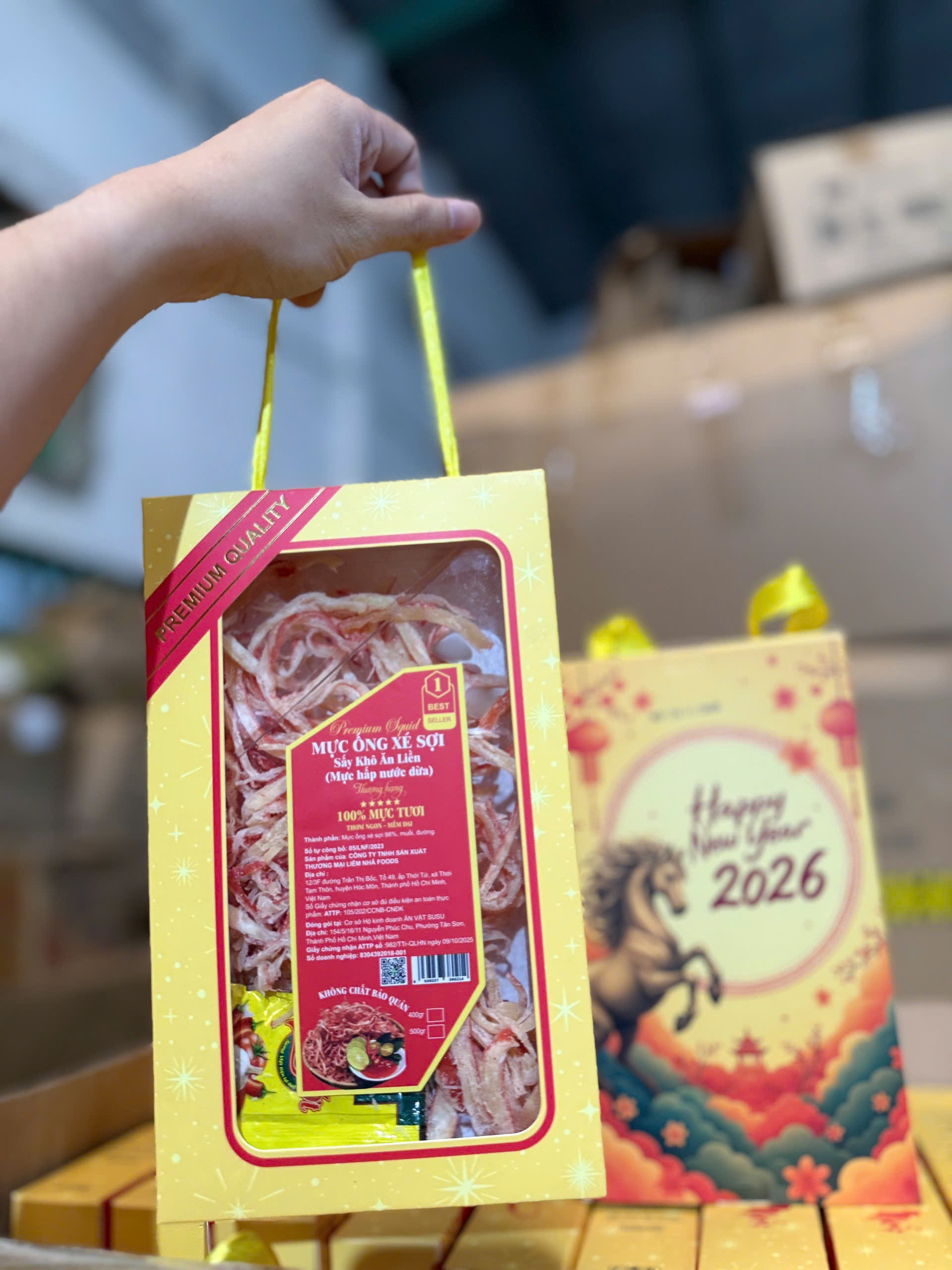 Sợi mực được tẩm ướp gia vị vừa miệng, sấy công nghệ hiện đại giúp giữ trọn độ thơm – giòn – dai mà không bị khô cứng.
