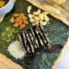 Thành phần: Rong biển tự nhiên 100% kết hợp hạt dinh dưỡng (hạt bí, hạnh nhân, hạt điều, mè trắng, mè đen, hạt óc chó…) và chà bông.