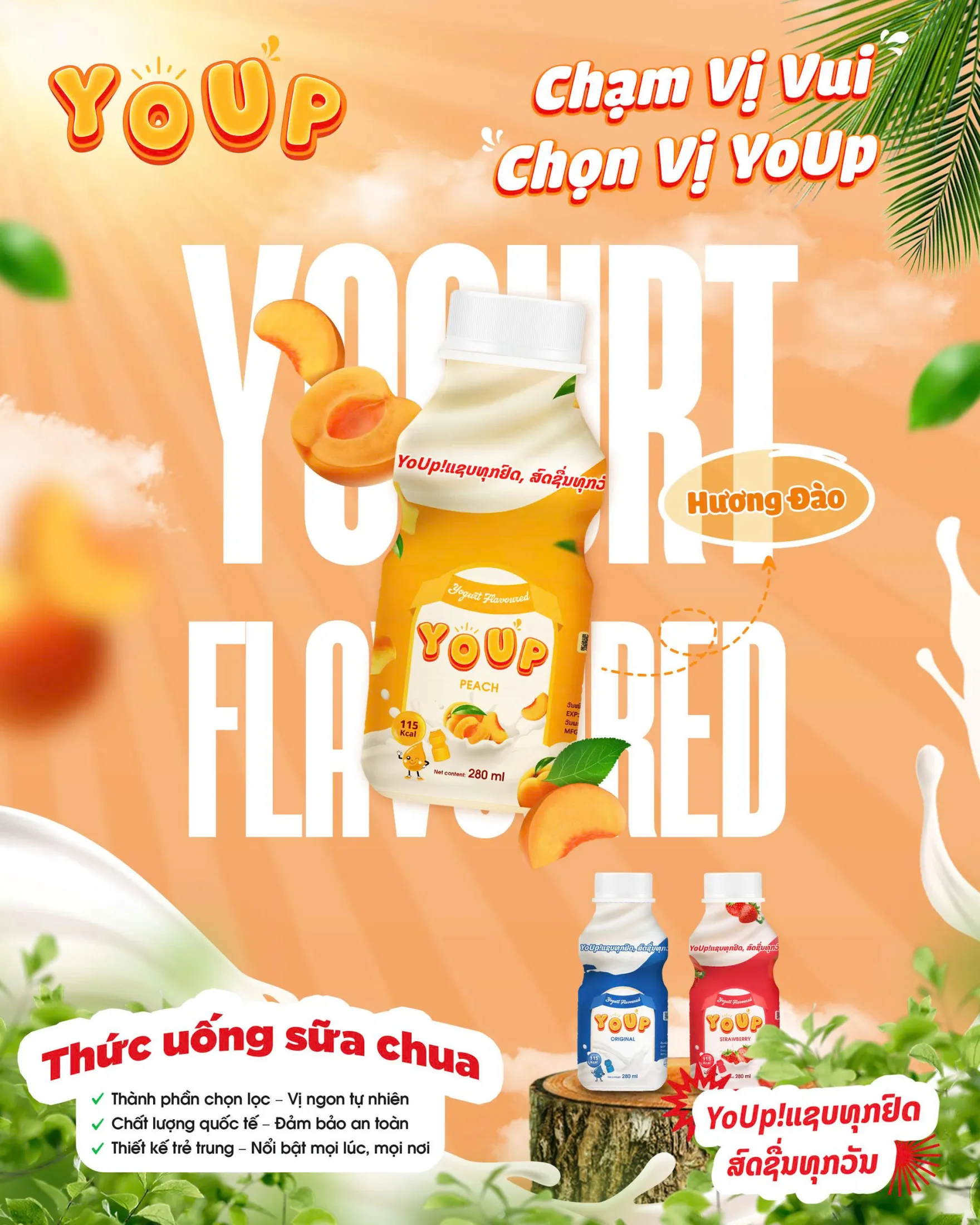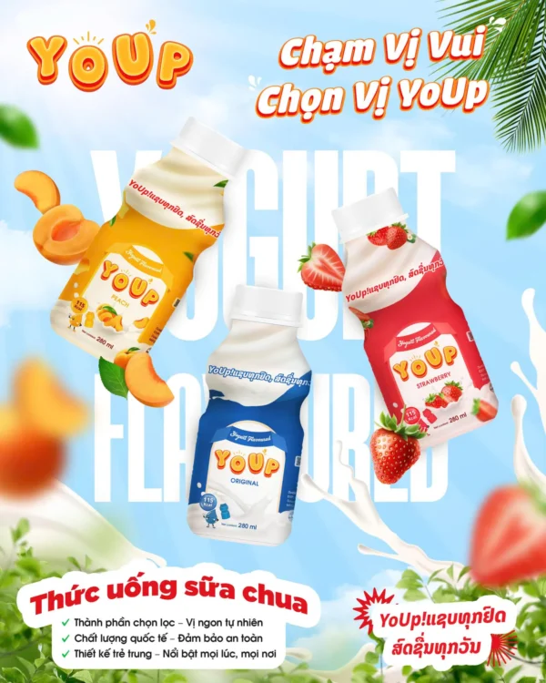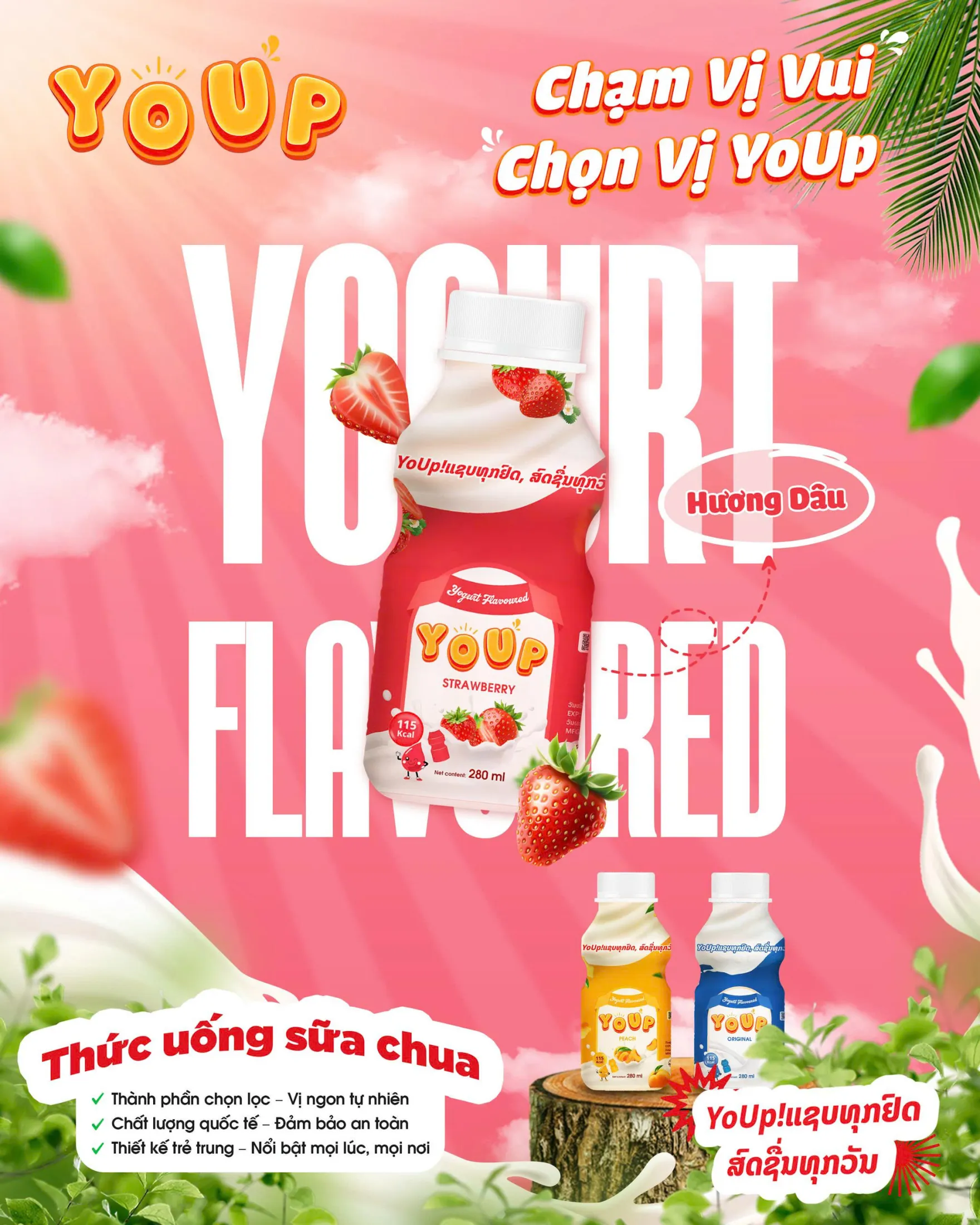 YoUp – sữa chua uống vị ngon thanh mát từ đường mía tự nhiên, chỉ 115 kcal/chai, vừa ngon vừa giữ dáng. Nguyên liệu nhập khẩu Nhật Bản, đạt chuẩn HACCP – ISO – GMP, an toàn tuyệt đối. Quy cách nhỏ gọn, tiện lợi mang theo mọi lúc, mọi nơi