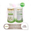 – Màu Xanh Lá [Hương Hoa Ly Ly]: Chiết xuất từ hương hoa Ly, Vitamin B, hạnh nhân, lá nha đam, Collagen, Aqua, và tinh chất sữa tươi. Hương hoa Ly thơm dễ chịu, các tinh chất làm sạch da, trắng da và cung cấp độ ẩm giúp làn da mịn màng, mềm mại, không gây nhờn dính. – Màu Xanh Dương [Hương Hoa Lan Nam Phi]: Mùi hương của hoa lan Nam Phi rất đặc biệt. Lan Nam Phi có linalool tạo sự tươi mát, tỏa hương hoa ngọt và hương gỗ cùng với hương chanh tinh tế. Được chiết xuất từ những tinh túy của hương hoa lan Nam Phi, hoa cúc, tinh dầu bạc hà, Vitamin B, hạnh nhân, lá nha đam, Collagen và tinh chất sữa tươi. Lưu hương trên da nhiều giờ giúp da mềm mịn, làm sạch, trắng da.